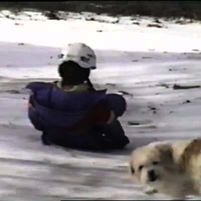 A father pulls a young boy and girl in a sled in the snow. As they sled down a hill the sled gets away from the man and he falls to the ground. A senior woman imitates the face of the girl.