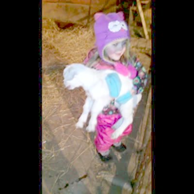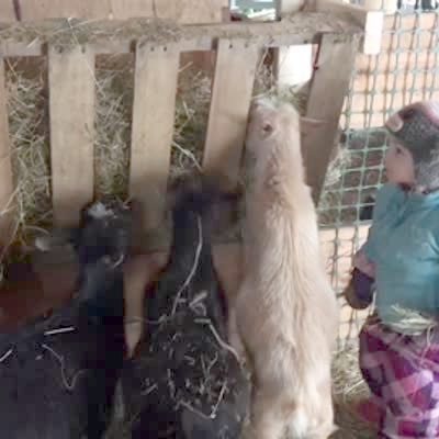 A tot girl holds a baby goat in a barn and screams, the goat imitates her scream.