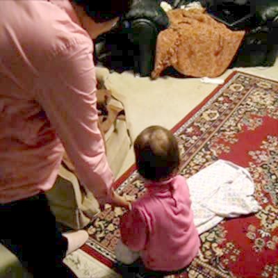 A pregnant woman walks in the living room and her tot daughter sticks out her stomach and copies the way she walks.