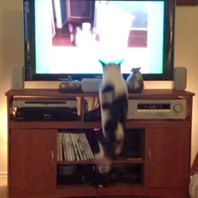 A Jack Russel Terrier dog jump up and down while watching a video of a dog jumping up and down on AFV on television at home.