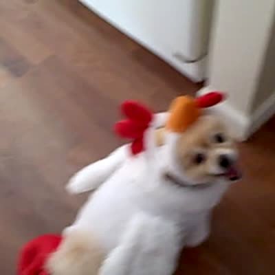 Pomeranian dog wears a chicken Halloween costume and imitates a chicken.