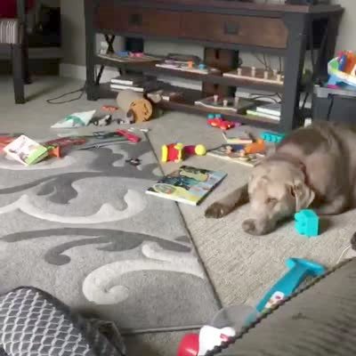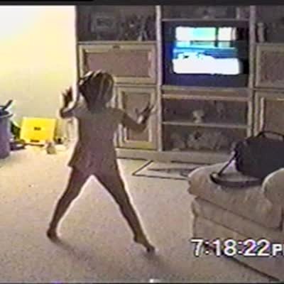 Tot girl tries to imitate fitness girls dancing on TV. She does a double somersault right into shelves and breaks them with glass stuff on them. No recovery