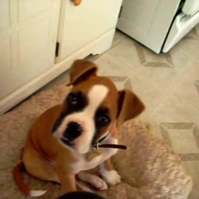 Tan puppy dog tilts its head when person off-camera whines at him in the kitchen.