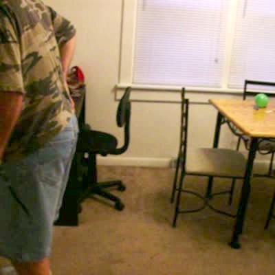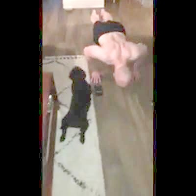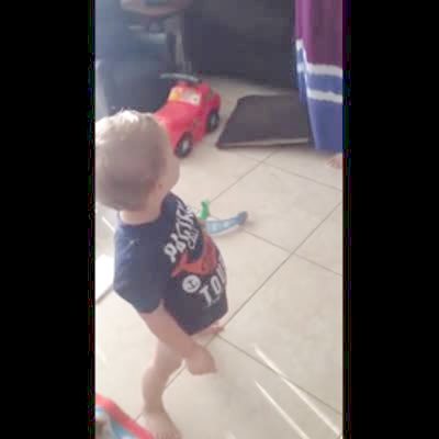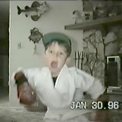 A young boy with boxing gloves pretends to do a training montage in the living room while "Eye of the Tiger" plays. He punches the bag, but slips and falls. Music rights not cleared.
