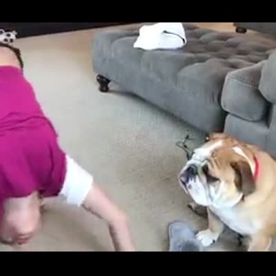 A girl does a bridge pose in the living room and her English bulldog dog lays on its side to copy her pose.