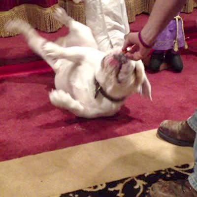 "Puppy Puppet Impostor" A bulldog dog stands on its hind legs in a row of puppets at home imitating them.
