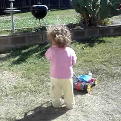 Tot girl pushes a toy lawn mower around the grass while dad mows for real. Imitates dad.