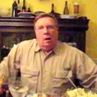 Man at table impersonates a turkey. Makes gobble sounds and shakes his face and arms.