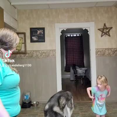 A young girl mirrors a man's movements for one hundred dollars at the kitchen table. The man sips the water out of the cup then spits it out later and the girl spits simultaneously to win the money.