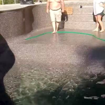 A young boy lies down in the shallow end of a swimming pool and slides into the deep end while it fills with water in a yard, then a man tries to follow him, but he falls on his stomach.