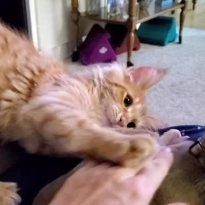 A kitten cat lies on a man's lap on a bed in a bedroom and the man raises his arms and says stick em up and the kitten cat raises its front legs above its head.