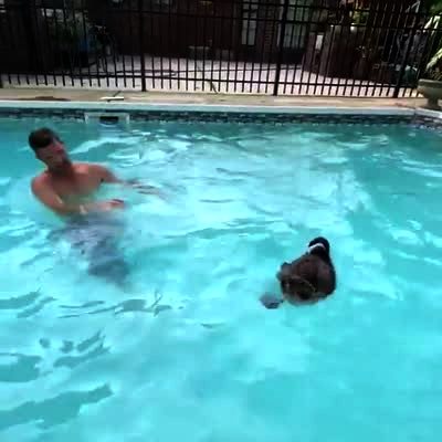A goose swims beside a man in the pool and they flip at the same time in a yard.