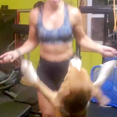 A woman jump ropes in a gym, and a beagle dog stands on her back legs and jumps with her.