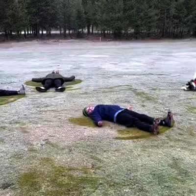 Three people lay on the ground and make snow angels and a dog imitates them and rolls in the snow in the backyard.