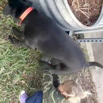 A young girl holds a bucket under a dog in the yard. The woman with the camera asks what she is doing and the girl says "milk a cow." The dog walks away and the girl follows it with the bucket. The dog lays down and the girl reaches to grab its penis.