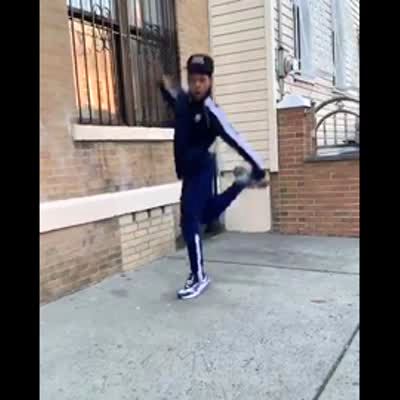 A man in a street shows off some impressive dance moves and he dances with his hat and does some cool flips and tricks with it.
