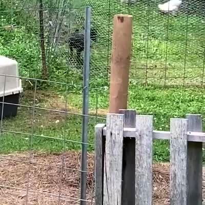A Nigerian dwarf goat climbs out of a secure fence on a farm.