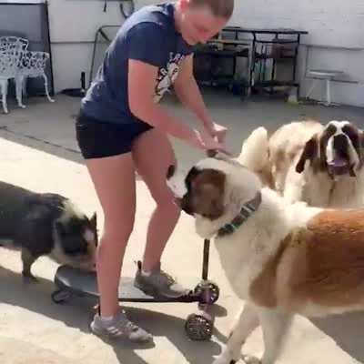 A potbelly pig pushes a teen girl on a scooter on a driveway.