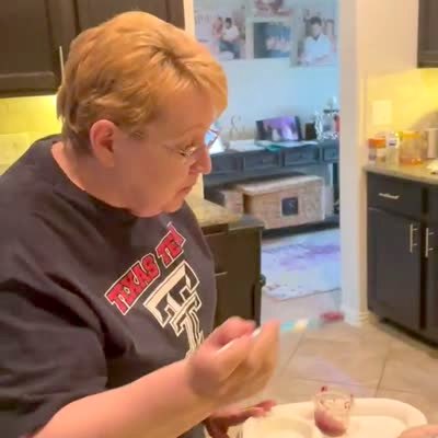 A senior woman loudly meows at the camera and laughs. Short heads. Short tails. Weird.