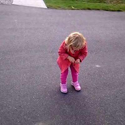 Tot girl has trouble blowing bubbles. She inhales loudly. Cute.