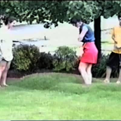 During rain storm, water builds up under patch of grass making the grass appear to be a giant water bed. Kids jump on it.