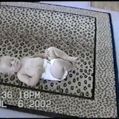 Baby in diapers is trying to do crunches, life fitness instructor on television. He also does squats