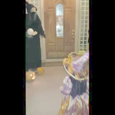A young girl tells her grandmother a Halloween witch decoration on a patio is wrinkly like her while they trick or treat at night.