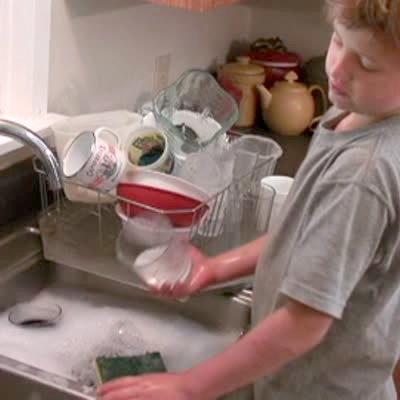 Young boy washes dishes and talks about doing it carefully, then drops and breaks a glass.