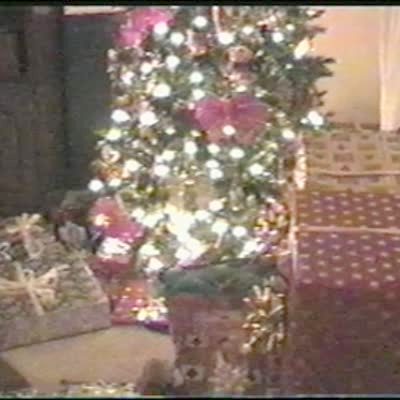Young boy opening Christmas gifts has a bike fall on his head.