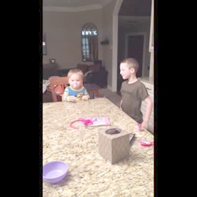 A tot boy throws a crumpled up tissue from his high chair and gets it into the small opening of a tissue box on a kitchen island table.