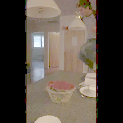 A teen girl walks on a kitchen island and tells her dad to hold the cup of water against the ceiling with a mop handle. She jumps down and he realizes it's a practical joke but he lets go of the mop and catches the water without a spill to "win" the joke.