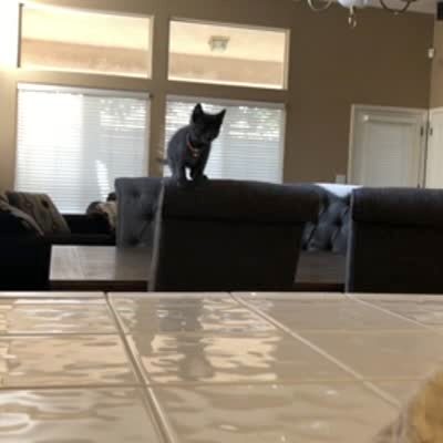 A kitten cat tries to jump from a chair to a kitchen island, but doesn't jump far enough and falls down.