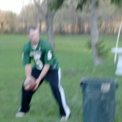 Young man wears football jersey while playing at the park. He poses, then runs and slips in the mud. Recovers and leaps / jumps over a trash can