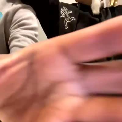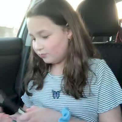 A young girl plays with a hair trimmer in the front seat of a car. She accidentally shaves off one of her eyebrows. A woman laughs and the girl freaks out.