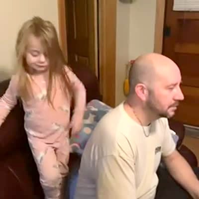 A man sits on a couch in the living room and a young girl rubs his shaved head with a brush. She says "daddy, your hair needs more hair."