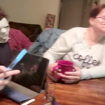 A man in a Michael Myers mask crouches next to a woman at the table and she turns and sees him and falls out of her chair and yells in the kitchen. Music rights not cleared.