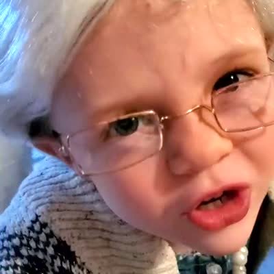 A tot girl wears a granny costume and says her back hurts.The woman with the camera asks how old she is and the girl says "thirty three."