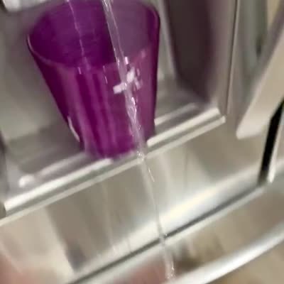 A teen girl in a kitchen holds a cup to a refrigerator water dispenser and asks another teen girl if she wants some water. She presses the lever, water shoots out, and the camera pans down to show the second girl lying on the floor and the water falling into her mouth while she laughs.
