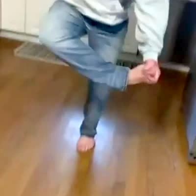 A man tries to hold his leg and jump over it with his other leg but he gets stuck and falls on his face in the kitchen.