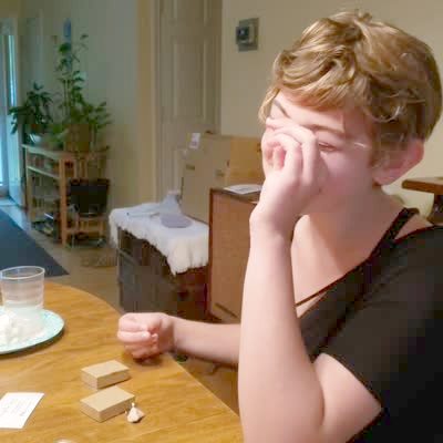 A teen girl gets a literal nose ring for her birthday in the kitchen.