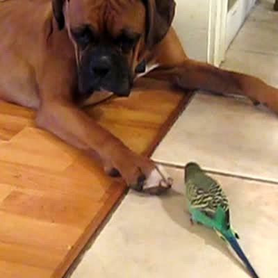 A boxer dog lays on the floor and stares at a parakeet while it talks and sings Jingle Bells. The dog is not impressed.