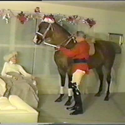 X-mas: Man, woman, and horse sing Jingle Bells in living room