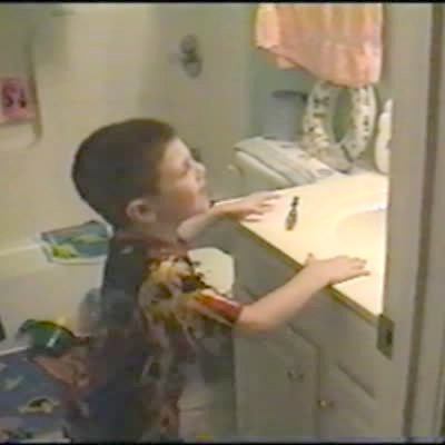 Young boy jumps up & down singing Jingle Bells & is very excited. Boy hits his knee on the bathroom sink & gets very mad. Boy yells at sister who's laughing at him. Christmas.