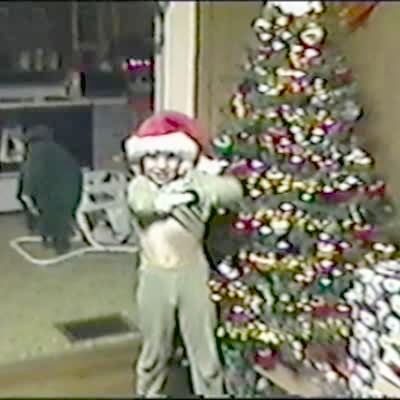 Two little boys are singing "Jingle Bells" in front of a Christmas tree when suddenly the tree falls over onto them and their mom who is filming.