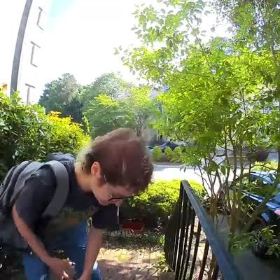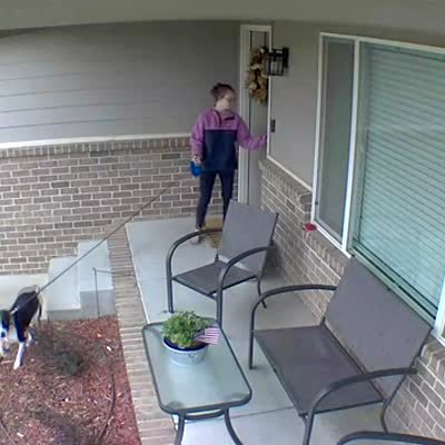 A woman walks her dog out the front door, and the dog runs and pulls the woman off of the porch.