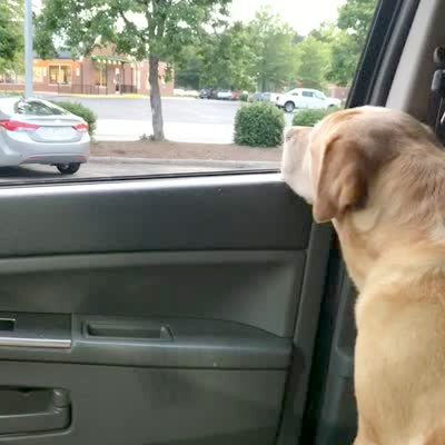 A dog sitting on the passenger seat lays its head on the window rest of a car and jumps when a woman unlocks the door.