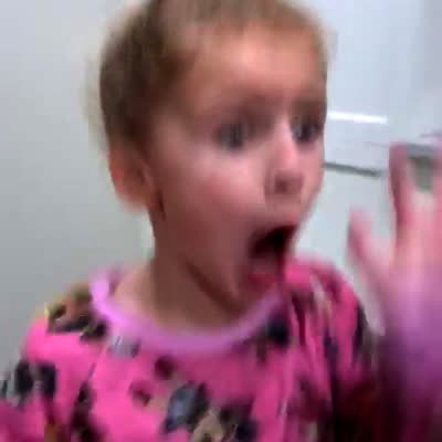 A man instructs his young daughter on swinging a bat at a pinata in a garage by holding his hands over hers on the bat. The man swings for her with such a force that she is swung over his knee and she cries.