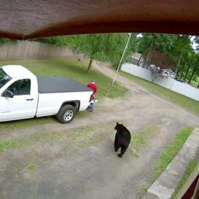 A bear walks up to a man on the back of a truck in a driveway and it startles him. Security footage.