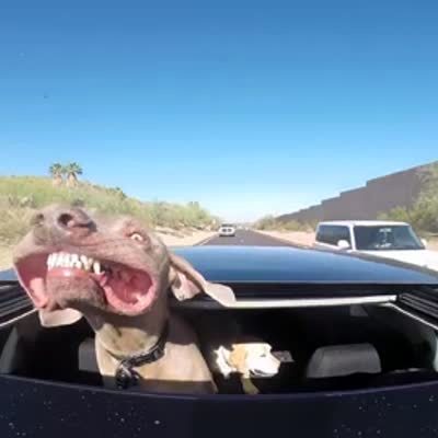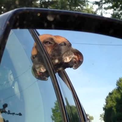 Boxer dog leans out of car window wearing goggles & his jowls flap in the wind.
