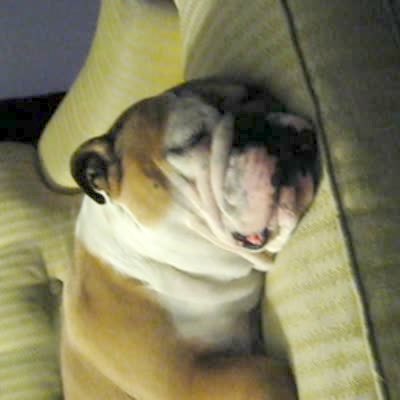 Bulldog is snoring and sleeping on the couch. Dog's jowls move while he snores.